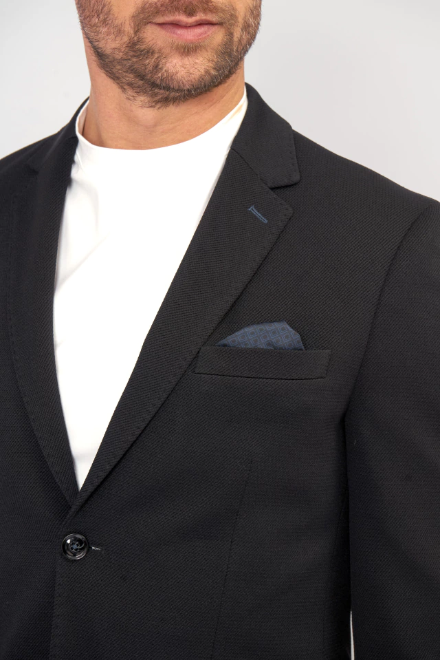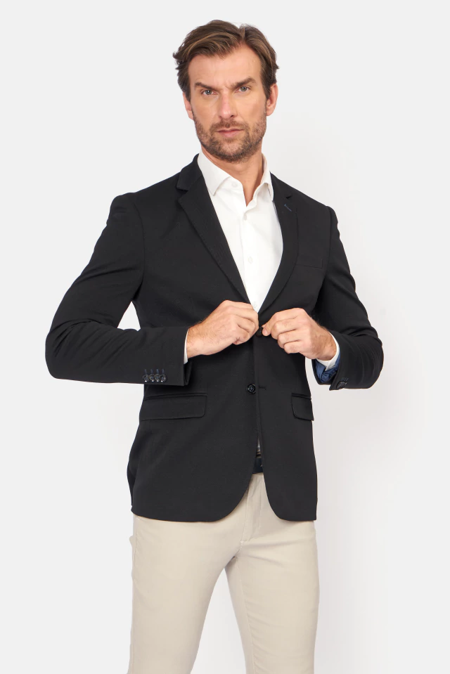 Peça casual, confeccionada em tecido de malha e meio forro nas costas. Possui modelagem ajustada, abotoamento simples com 2 botões, bolso no peito com detalhe de lenço combinando com o forro estampado, bolso ticket e bolsos inferiores frontais tipo flap. Possui bolso interno e fenda dupla na parte posterior. Punho com 4 botões sobrepostos fixos, ombreiras e forro estampado em cor contrastante.
