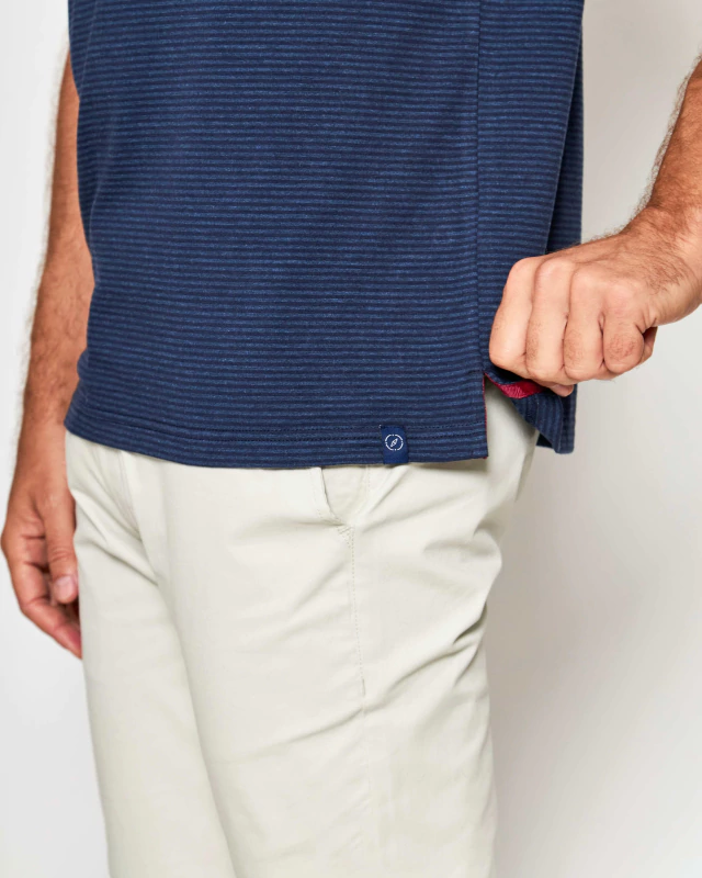 Polo confeccionada em tecido de algodão com elastano, modelagem slim, gola com textura, 3 botões frontais, manga curta com punho, etiqueta do símbolo da marca na barra e fenda lateral com cordão.