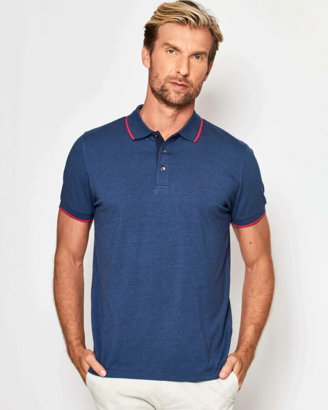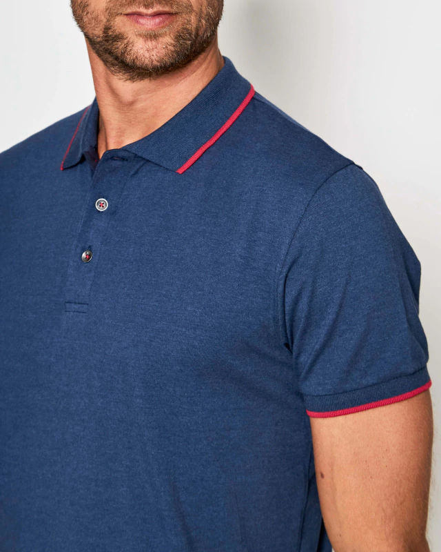 Polo confeccionada em tecido de algodão com elastano, modelagem slim, gola com textura, 3 botões frontais, manga curta com punho, etiqueta do símbolo da marca na barra e fenda lateral com cordão.